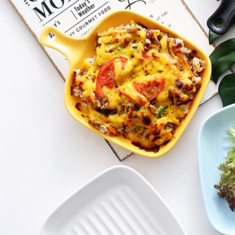 The ceramic baking plate comes in a vibrant yellow colour. The baking tray can be used for baking, grilling, or even serving dishes directly which has been made easy with the handles. The baking dish can be used for baking and serving seafood, cookies, and evening snacks.