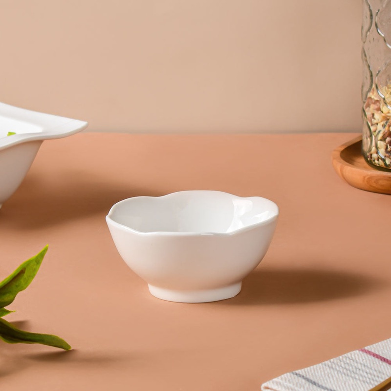 The white ceramic bowl provides a touch of elegance to any neutral eating space. During housewarming parties, the white dish shaped like a flower is excellent for serving delicious chutneys or sauces alongside yummy snacks, munchies, or nibbles to family and friends. In the bowl, one can serve almonds, cashews, and even mouth fresheners.
