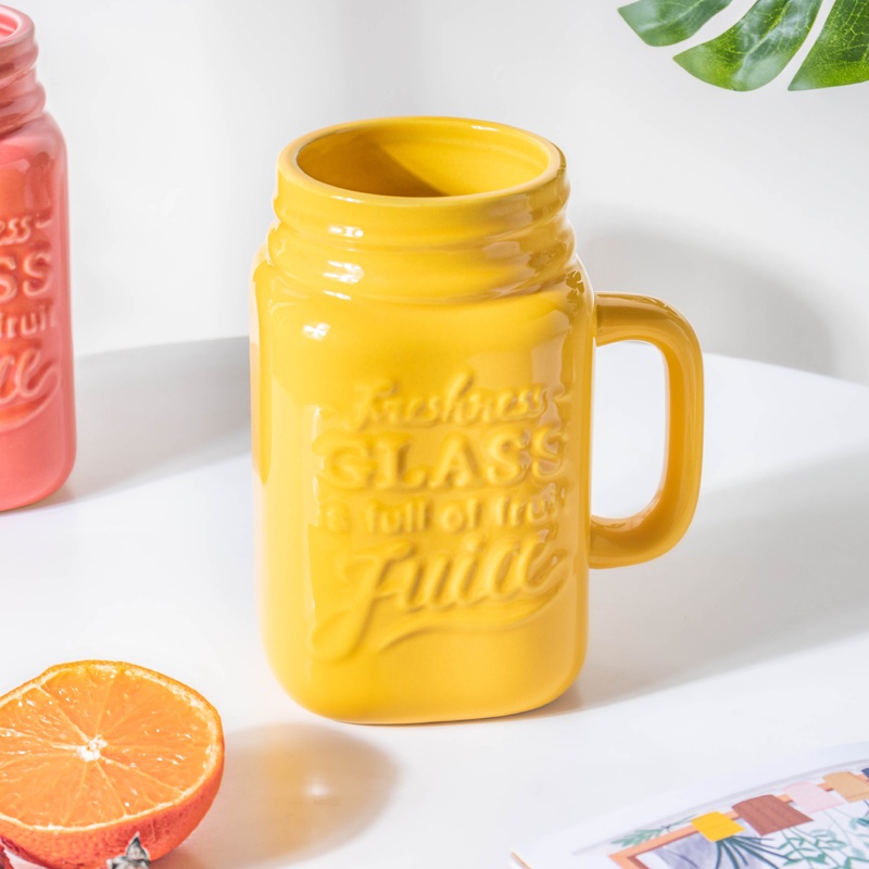 The ceramic juice cup is the ideal companion for one's next social gatherings or house parties. The cup has a c-shaped handle and a high rim. Any study desk or tabletop will benefit from the addition of the juice cup. The yellow cup with unique typography