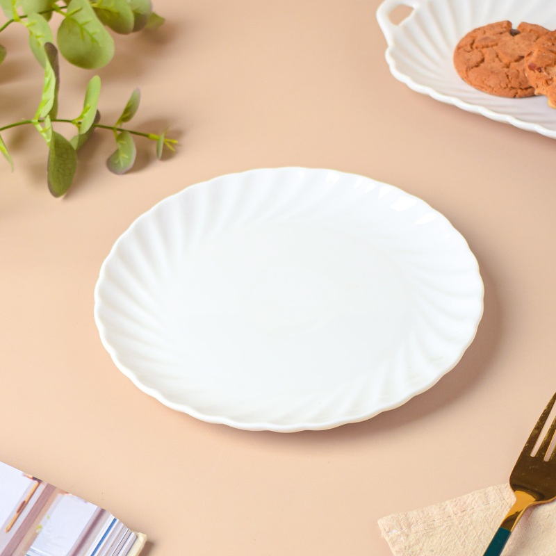 A dinnerware collection will surely benefit from the addition of a white ceramic plate. Unique textures beautify the rims of the white dish. The dish can be used to offer nibbles, appetizers, snacks, or munchies to visitors during house parties or get-togethers. Noodles, spaghetti, and a variety of other dishes can also be served on the ceramic plate.