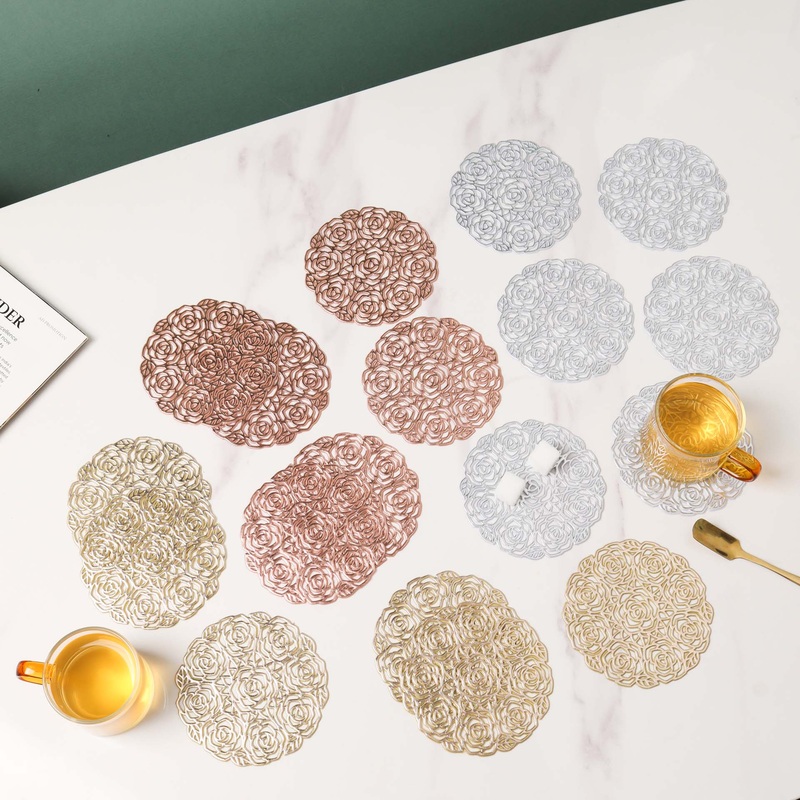 The PVC coasters are pretty and shiny and also extremely useful for protecting one’s tabletop from getting scratched or charred by heavy beverage glasses, cups, and dessert bowls. The trendy coasters are guaranteed to give the dinnerware a new appearance. The coasters have a fashionable rose blossom design in gold, rose gold, and silver, which can add a stylish accent to any room. The coasters, which are made of high-quality PVC and are fantastic to display vases as well and provide an understated elegance to the scene.