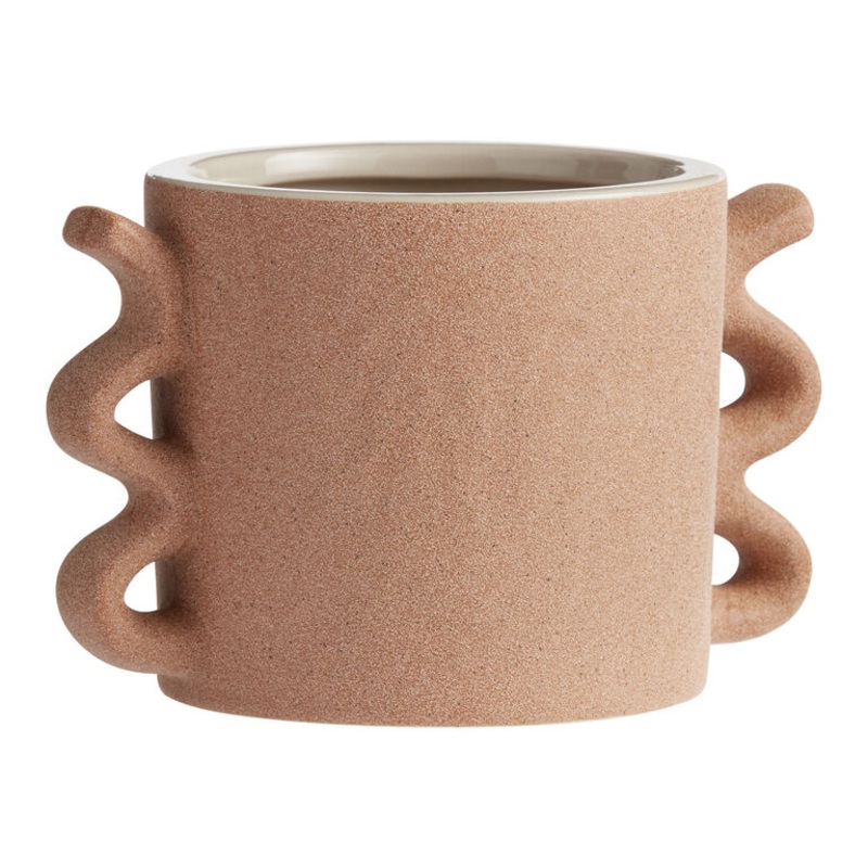 Playful design and rich texture combine in this sculptural planter, crafted of ceramic and fitted with whimsically wavy handles. With smooth, natural glazing inside and a sandy, rust-colored finish outside, it brings touchable appeal to tabletops and shelves. Pair this warm-hued pot with a favorite plant to create a delightful decorative accent.