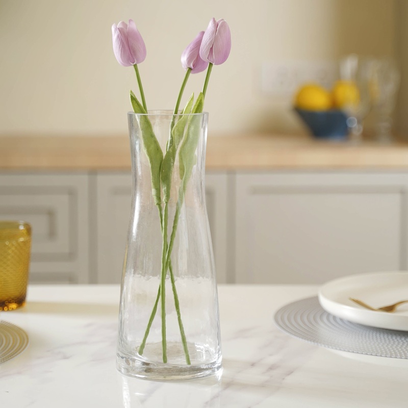 A transparent glass vase shaped somewhat like an hourglass suits colorful fresh flower arrangements. Place decorative pebbles at the bottom of the vase to give a refreshing look to that corner of the house where one decides to place the vase. The smooth finish and lead-free built of the vase make it an appealing product one should never refuse. The simple design of the vase may help its owner go all DIY with how they plan to make flower arrangements. The vase looks attractive whether it is filled with botanicals or displayed solo.