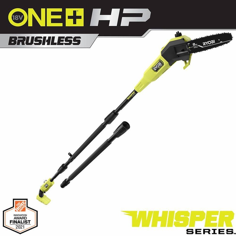 The RYOBI 18V 8 in. HP Cordless Pole Saw will keep your trees and yard looking the best in the neighborhood. The ONE+ HP Technology delivers up to 30% faster cutting. Not only are you able to quickly get the job done, but youll be able complete it quietly as this pole saw is part of RYOBIs WHISPER SERIES line of products, our quietest range of products. With extension up to 9.5 ft., angled cutting head, and in-line motor, this pole saw is ideal for pruning and limbing for easy branch removal. It also has an automatic oiler, tooled chain tensioning, and on-board tool storage for your convenience. The RYOBI 18V 8 in. HP Cordless Pole Saw is compatible with all RYOBI 18V batteries. This tool is backed by a 3-year warranty. Battery and charger not included.