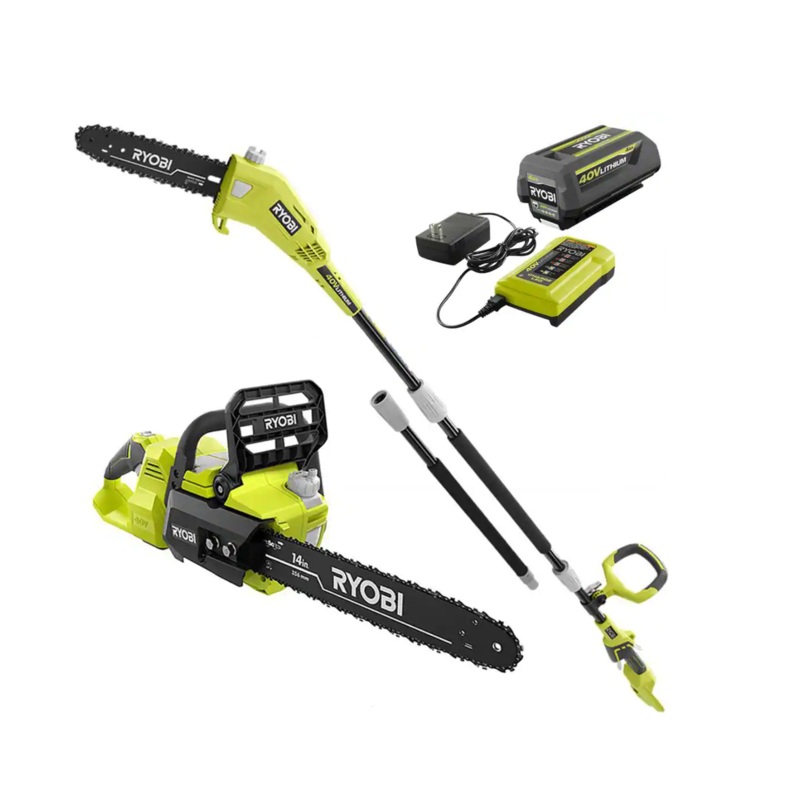 Includes: 40-Volt HP chainsaw, 40-Volt pole saw, 4.0 Ah battery and charger - Works with all RYOBI 40-Volt lithium batteries