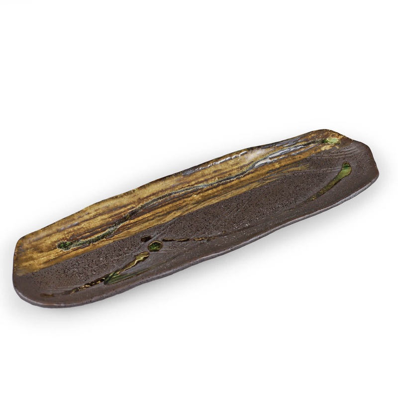 Featuring a matte base with glossy brushstrokes that resemble the texture of wood, this serene plate features a stunning blend of earthy colors including browns, greys, and subtle green highlights, capturing the beauty of nature.
