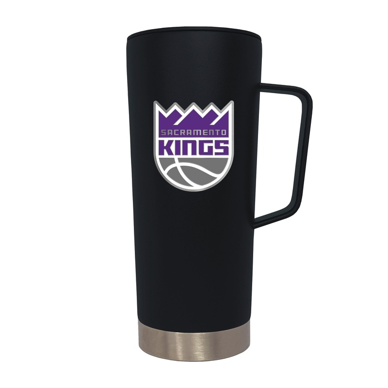 This 18 oz. ROADIE with Handle Travel Mug is made of vacuum insulated stainless steel and features a 3-dimensional handcrafted emblem.