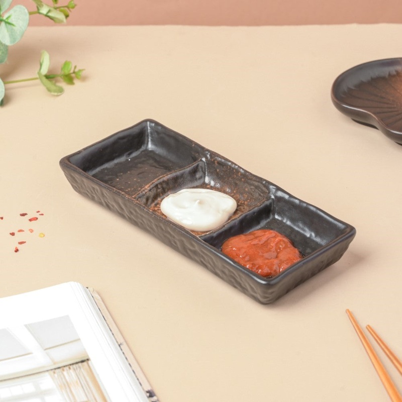 Serve dips of choice in the hand-crafted ceramic sectioned dip plate. The 3 sections allow one to dip snacks in their sauce of choice for a gala evening gathering. The ceramic dish features a matte finish with black colour and subtle shades of brown. Exuding a rustic finish, the dip plate can be paired with dark-coloured plates for an eclectic table setup.