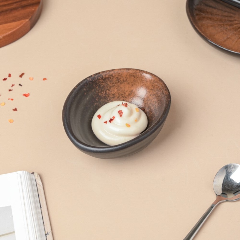 The rustic appearance of the ceramic dip bowl brings out the essence of raw craftsmanship. The stoneware dip bowl's unique shape makes it easy to pour the dip on lip-smacking snacks. The earthy handmade 60ml dip bowl can be used to store melted cheese late