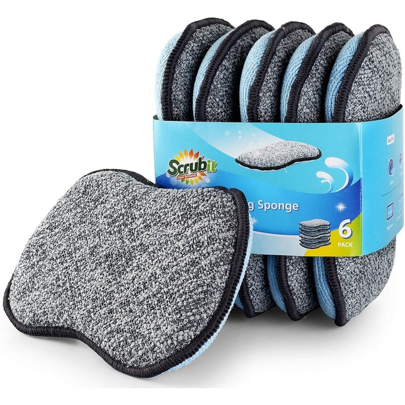 Multi-Purpose Scrub Sponges for Kitchen by Scrub- it Non-Scratch Microfiber Sponge Along with Heavy Duty Scouring Power Effortless Cleaning of Dishes, Pots and Pans All at Once( 6 Pack, Large). Clean The Mess Without The Clutter Youve already got a scourer, washing cloth, drying cloth and maybe even a marigolds cluttering your kitchen. Why put up with the mess? This sponge eliminates 3 of those clutter-causing items, with the scouring side making any pot an easy clean, and the microfiber side cleaning dishes and glasses with ease.