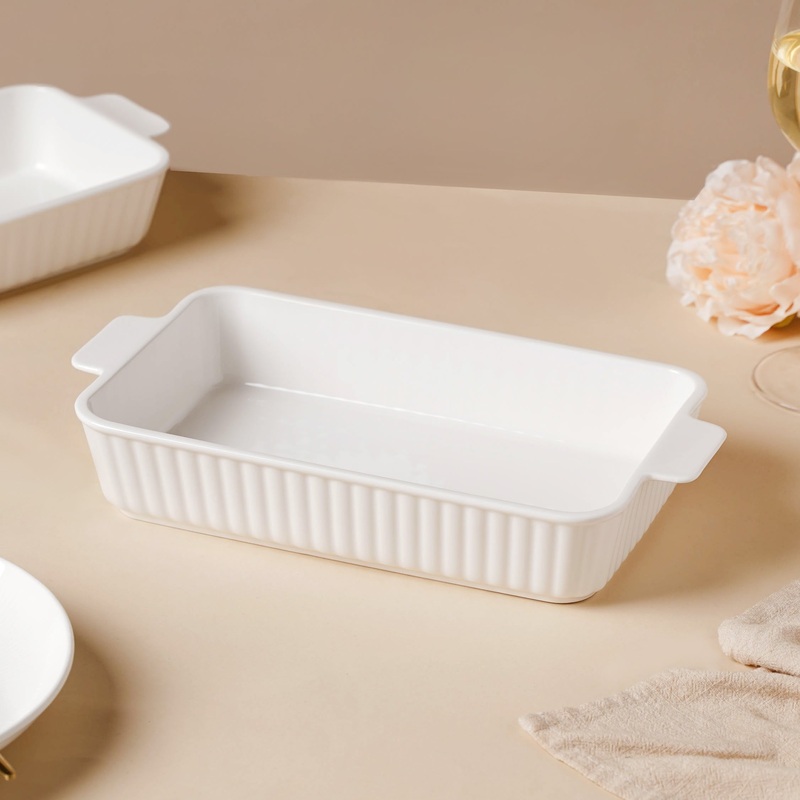 The rectangular ceramic baking dish is molded with premium-quality ceramic which is resistant to the high heat levels of the oven. The wide area of the dish enables one to bake more volume of the food items. Bake steaks or cheesy pasta and lasagna in the white ceramic dish. The ceramic baking plate may also be used to bake and serve cookies, cupcakes, and pies.