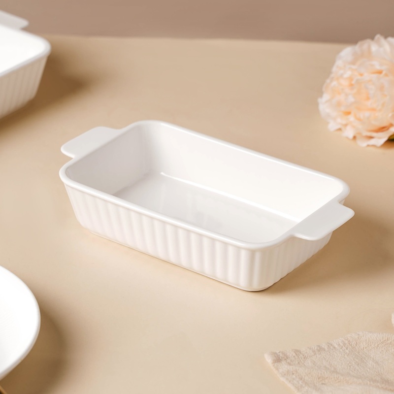 Bake and serve in one dish! The rectangular baking dish has a wide area, which may be used to bake chicken, seafood, pasta, or delicious cakes and cookies. The dish has been manufactured with robust chip-resistant ceramic, brilliant white color, and ceramic sheen to be a classic addition to one’s collection of ceramicware.