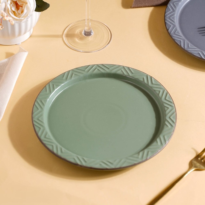 The matte-finished, elegant green snack dish gives the table a modern touch with its unique sleek form. The snack plate has a raised, textured rim. The plate's distinctive shape makes it the perfect accent for any gathering to serve fritters and fries.Nest