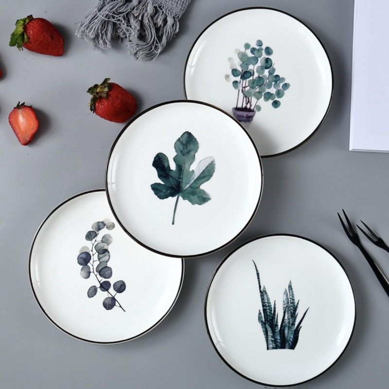 The ceramic plate with an elevated black colored rim is ideal for serving snacks to upgrade any table setting. The white plate is ideal for bringing convenience to the dinner table with an enchanting leaf print on the surface. The side plate comes with various motifs to appease every nature enthusiast. The chic plate has a long-lasting design and can be used as a noodle plate as well.