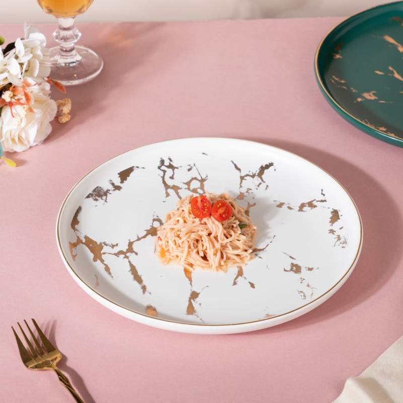 The deluxe appeal of the ceramic plate will make the food look delicious. The white dinner plate is made of premium quality and is an excellent addition to the house. Even a quirky dinner table will need the rich marble design plate to add charm. The sprayed golden design against the marble-like background looks spectacular.