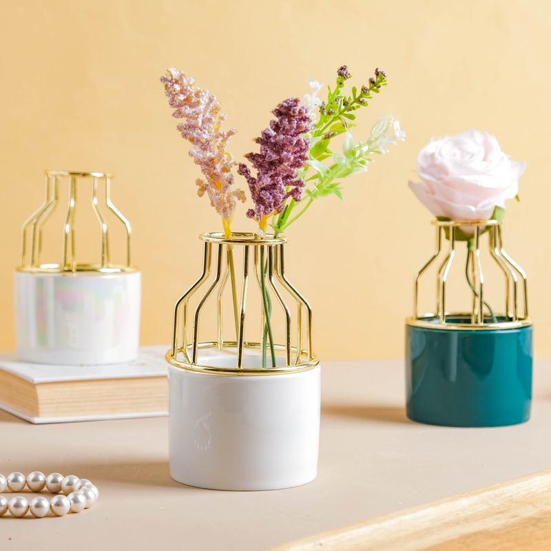 The stylish metal top attached to the ceramic planter makes it look like a tall vase. The geometric planter would add that extra class to ones home. Grow plants in this elegant planter and settle them in the corner, making them attractive and eye-catching.