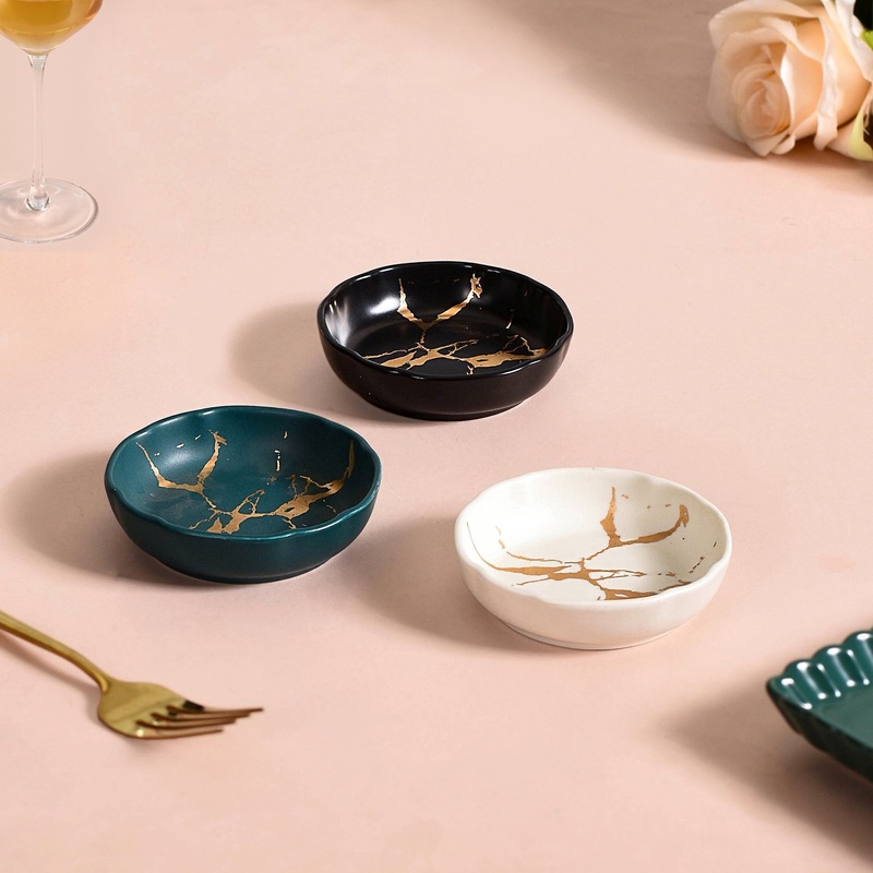 Side ceramic plate with a glossy finish and strings of golden engraved within which makes for an eye-catching addition to the dining table. The small plate can be used as a snack bowl, or for serving sweet dishes for serving a person at any time of the day. It is purchasable in 3 different shades.
