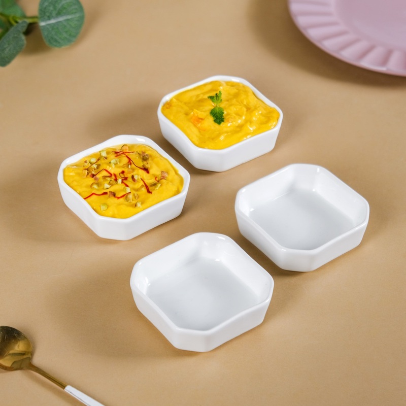 Our set of four ceramic dip bowls exudes both sophistication and utility. With a timeless white hue, these bowls seamlessly complement any table setting, whether adorned with vibrant pastel dishes or traditional gold and white plates. Beyond their primary function for serving sauces, these versatile bowls can also elegantly present mayo dips, chutneys, or petite dessert portions.