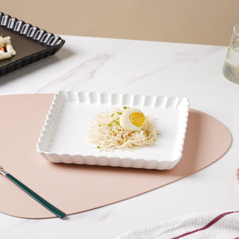 Serve sushi or appetizers on these square-shaped platters for house gatherings to up the fun factor. The platter is made of ceramic and has a lovely matte finish that adds to the attractiveness of gatherings. The white color of the platter highlights the presented dish, making the composition appealing to the eye.