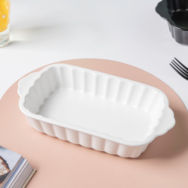 A jazzy hue and amazing pattern accentuate the appeal of the white contoured baking dish. Baking trays, whether for serving or baking, are a fantastic addition to any culinary cabinet. The even interior surface of the white ceramic baking pan contrasts wit