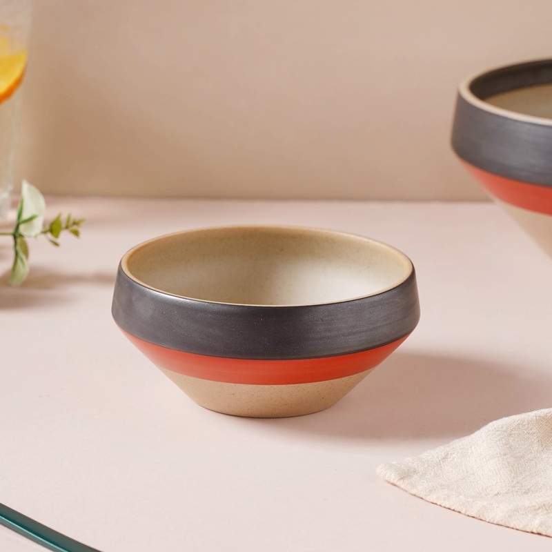 The small bowl in beige is accentuated with a red and black outer surface to make the bowl appealing. One can have pudding, sweetmeat, ice cream, or even soup in this small bowl. Use the bowl as a snack bowl for serving munchies or nibbles with tea or coffee.