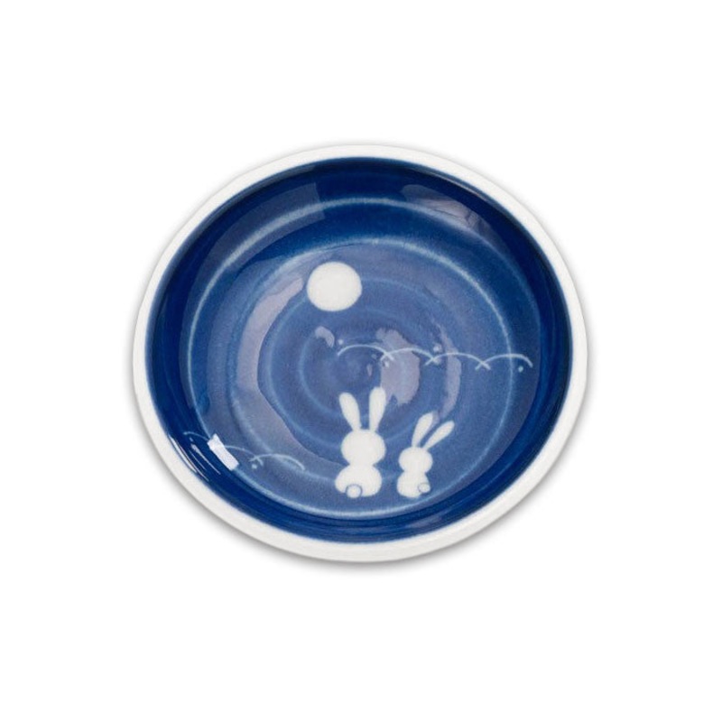The Moon rabbit is a mythical figure in Japan based on the belief rabbits live on the moon by perceiving the dark markings on the moon as a rabbit. This dish describes the myth with a blue glaze. A small dish is typically used to serve soy sauce but can be used for small portions of appetizers or amuse bouche.