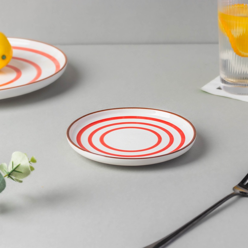 Concentric circular lines form an opulent design along with the contrasting brown rim of the snack plate. Manufactured with high-quality glazed ceramic, the plate is the definition of luxury. The sophisticated minimalist plate is a perfect mixture of elements that portray the ultimate amount of lavishness. From starters to serving snacks or fresh fruit salad, the snack plate will suit all needs.