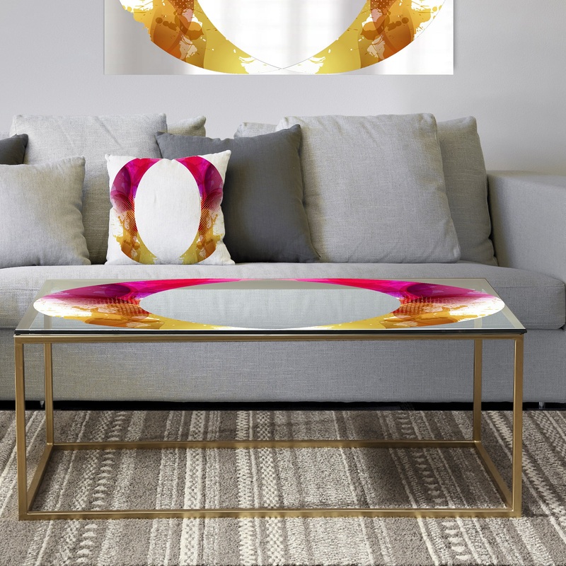 Bring a grand splash of color into your living space with this traditional coffee table by Designart. Goldtone metal legs offset the printed glass top for sophisticated design appeal while the ring of pink and goldtone speaks to your artistic side while bringing a burst of color to your home decor.