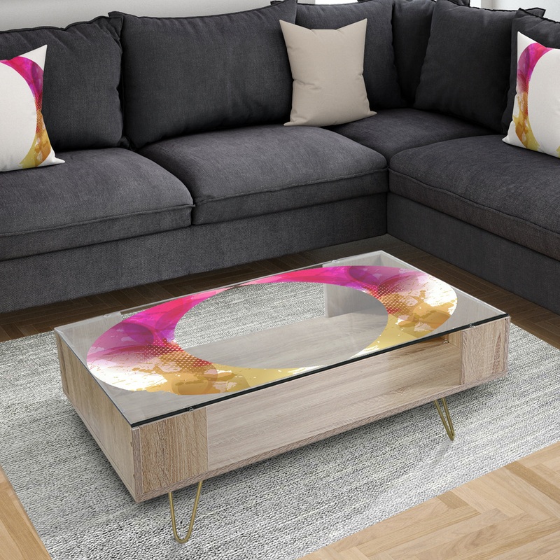 Brighten your home with the splash of color on this traditional coffee table by Designart. A clear oval surrounded by a splash of pink and gold offers a viewpoint to the shelf below, which is a perfect place to display a plant or unique decor item. The tabletop is made of glass, with the design printed on the underside to keep it safe from scratches.