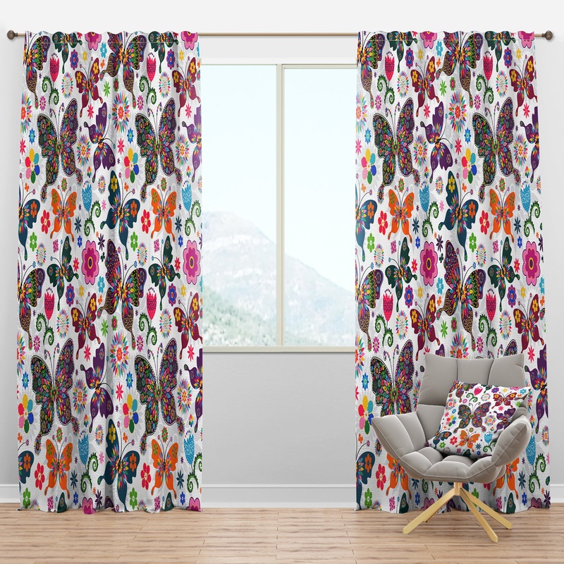 Lend a whimsical touch to your window with the bohemian and eclectic style of these Designart ‘Spring Pattern’ curtain panels. The bright colors in the butterfly and floral pattern bring decorative charm to your room, while the faux linen fabric boasts a semi-sheer design to gently filter light.