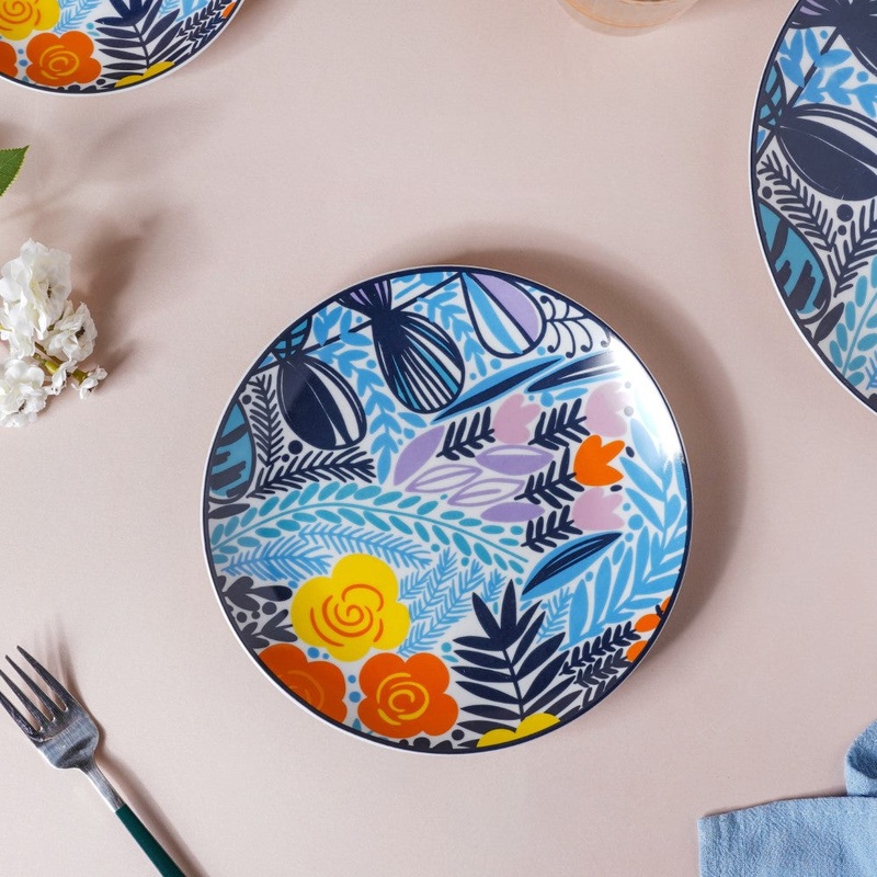 Flowers and leaves are the accessories of Goddesses. Not only do they enhance their beauty, but they also have gained their natural value through this ornamentation. The floret snack plate, with its blossoming flowers and sleek leafy branches, emerges as the trendiest in class, pattern, and style. The divine elements are infused with the sturdiness of ceramic. This food-grade 8-inch snack plate is great for serving crispy Cantonese spring rolls, chicken wings, momos, and crab rangoon.