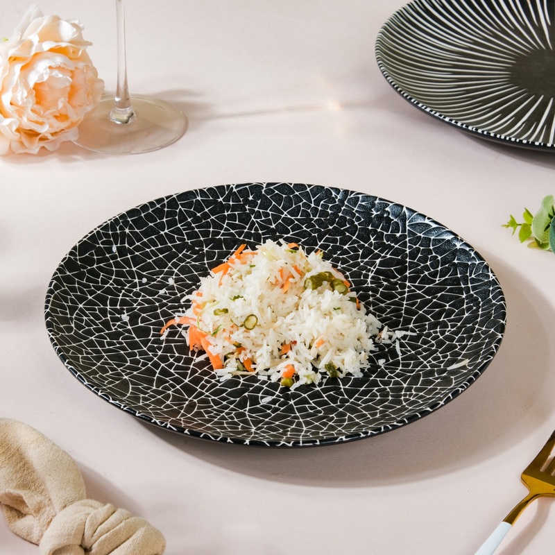 The sleek dinner plate is a patterned plate with a modern aesthetic, capable of making any breakfast, lunch, or dinner table stand out. Featuring a textured pebble-patterned surface, the platters can be used for serving rice, breads, noodles, salads, or pasta. The ceramic dinner plate can elevate any dinner table styling with the white patterns that come on the black surface of the plate.