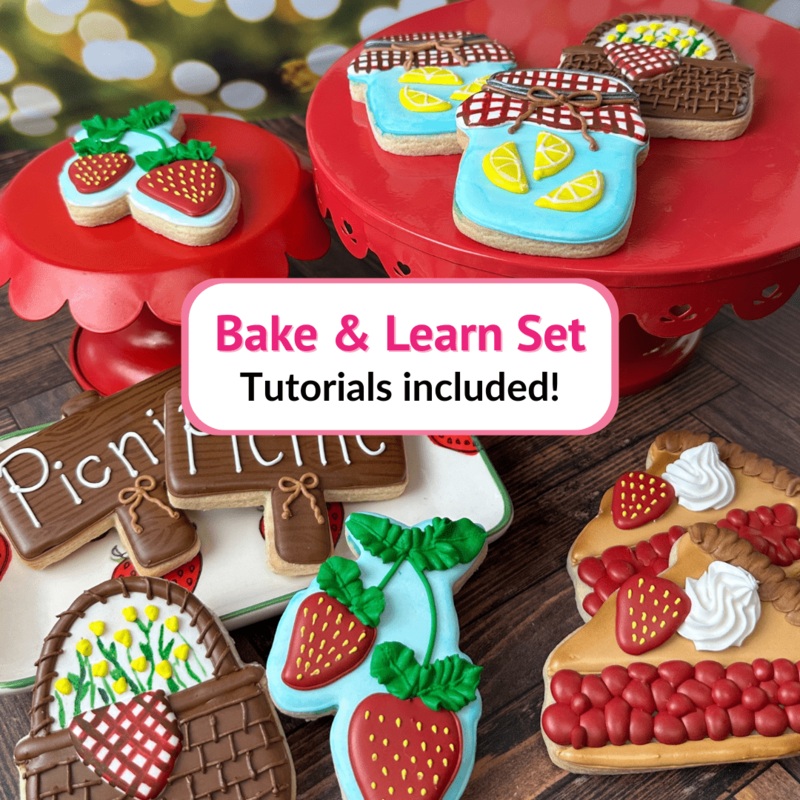 Bake and learn! Get ready to level up your cookie game! This Strawberry Picnic Bake & Learn set includes 5 custom-designed cookie cutters plus exclusive access to a tutorials page. There you will see a step-by-step video tutorial for the Mason Jar cookie,