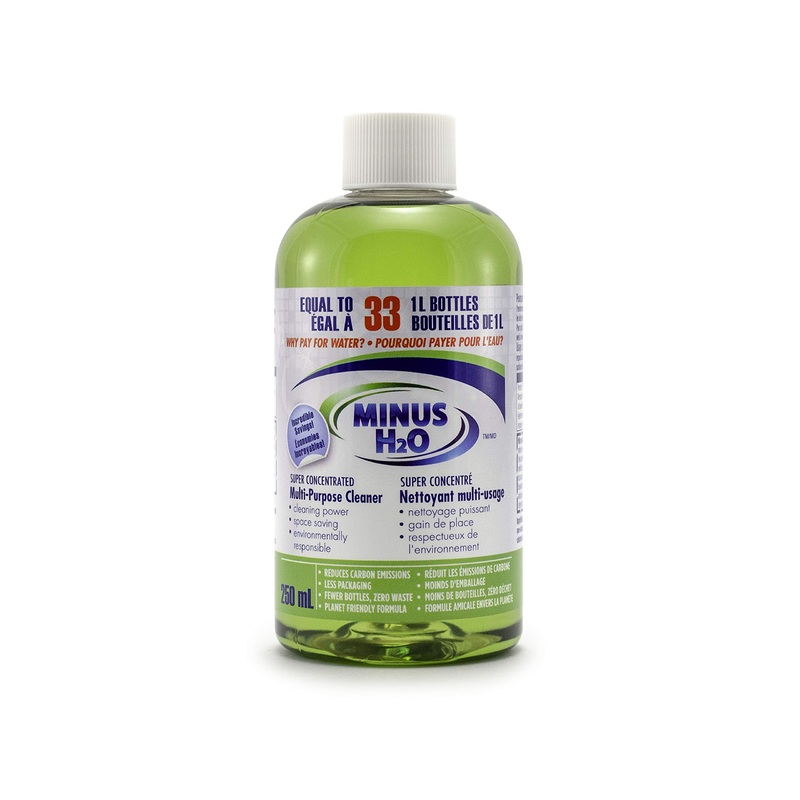 Minus H2O All Purpose Cleaner concentrates are a great value. One capful of Minus H2O makes 33 oz of cleaning product. All you do is mix the recommended amount of Minus H2O with water in any bottle, spray bottle or bucket and begin tackling hard surfaces. Our formula is powerful and penetrates to remove dirt and grease on surfaces, yet is safe enough for hardwood, leaving a clean and fresh scent. Minus H2O is committed to providing non-toxic cleaning solutions that have a positive impact on our environment by not adding water; helping to reduce the amount of plastic required to produce. Our smaller bottles mean less packaging going into recycling and landfills, in addition to reducing storage and transportation related costs. Less energy involved in the process leads to lower carbon emissions. You can also feel good when you purchase Minus H2O products because $0.10 from every bottle purchased is donated to organizations that are focused on environmental conservation and/or clean water initiatives.At Minus H2O, our mission is to significantly reduce carbon emissions and plastic pollution. By taking the water out of our products, Minus H2O uses far fewer and smaller bottles, which drastically reduces the amount of packaging, plastic waste and energy used to manufacture and deliver our products. Powerful non-toxic multi-purpose concentrated cleaner that penetrates to remove dirt and grease. NO water added. Use our product to refill costly single use spray bottles and hand held wet mops. Just add water and product as directed in any bottle, spray bottle or bucket and it is ready to use. Your purchase of any Minus H2O product helps the environment as we donate $0.10 from every product sold to local charities committed to environmental conservation and/or clean water initiatives. Minus H2O All Purpose Cleaner Concentrate 8.45 fl oz bottle makes 8.71 gal (33 bottles) of cleaning solution saving customers up to $95 versus other leading all-purpose cleaners.