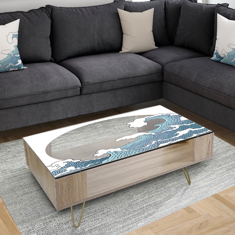 Capture the waves with this artistic metal coffee table, standing on goldtone hairpin legs. The table’s design is printed on the underside of the glass surface with high-density Italian inks to protect it from scratches. This piece also boasts a large lower shelf for storing items.