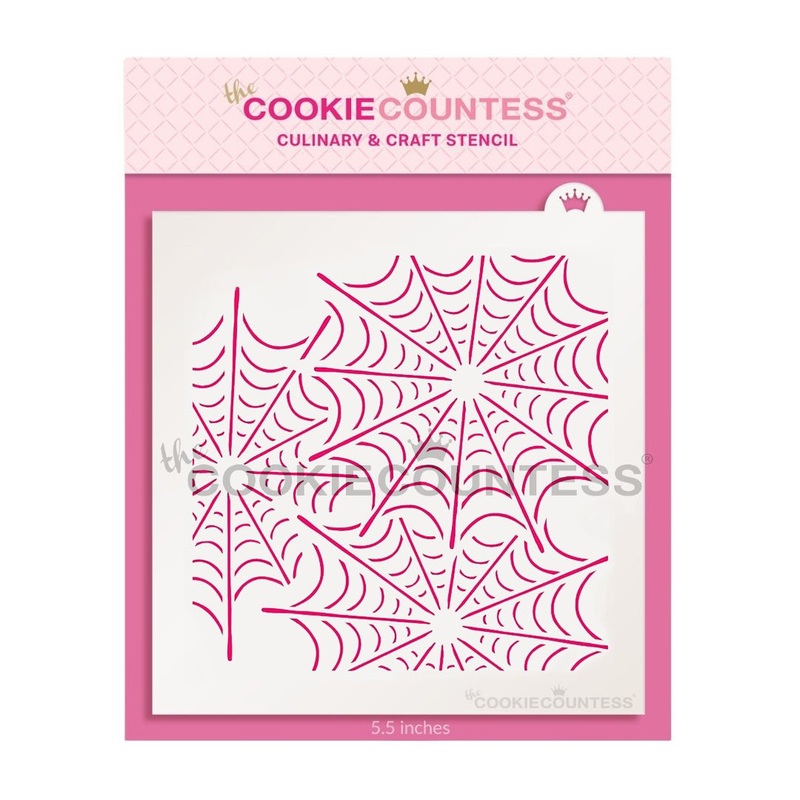 Tangled Webs pattern stencil for cookies, cakes, and crafts.Overall stencil size is 5.5" x 5.5".PINK sections in image are the open sections.Stencils are 5mil Food Grade plastic, washable and reusable.Made in the USAGreat for Halloween, or Spider-Man and s