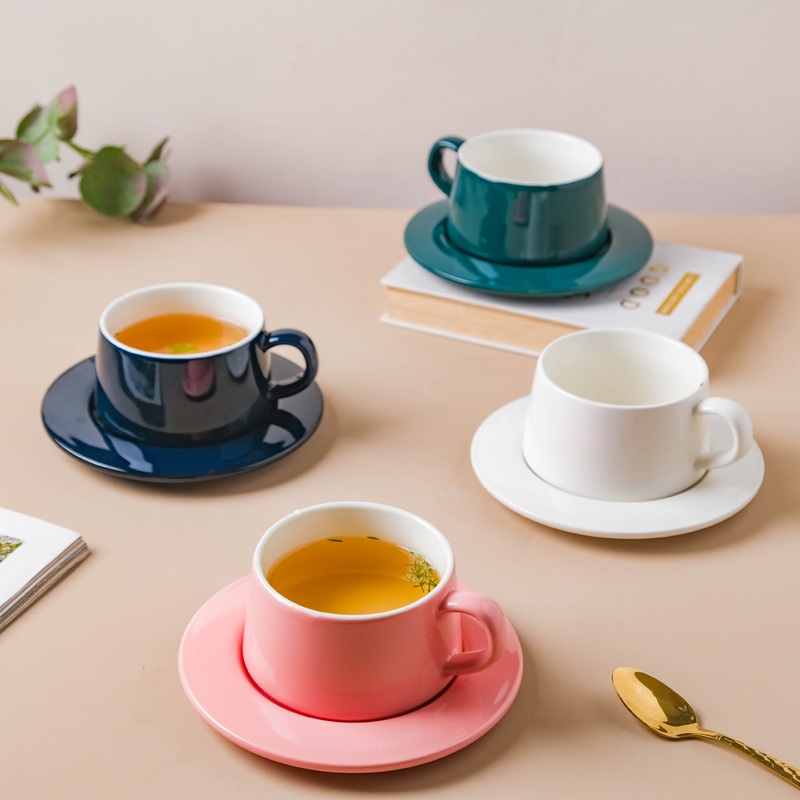 A teacup and saucer set made of ceramic for the early morning caffeine fix. The ceramic cup and saucer set is perfect for having tea, coffee or hot chocolate. There are a number of color variants to choose from. The smooth polished surface makes it a sober and sophisticated addition to the kitchen and the handle makes it easier to pick up and place.