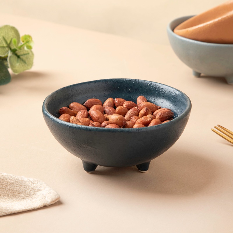 The teal bowl with three tiny stands will liven up the tablescape and lend a modern appeal to the decor. Pair the teal bowl with either teal or ivory snack plates and snack bowls to create a snack set. From pudding to ice cream to any sweet treat, the matt textured bowl will look elegant in any decor setting.
