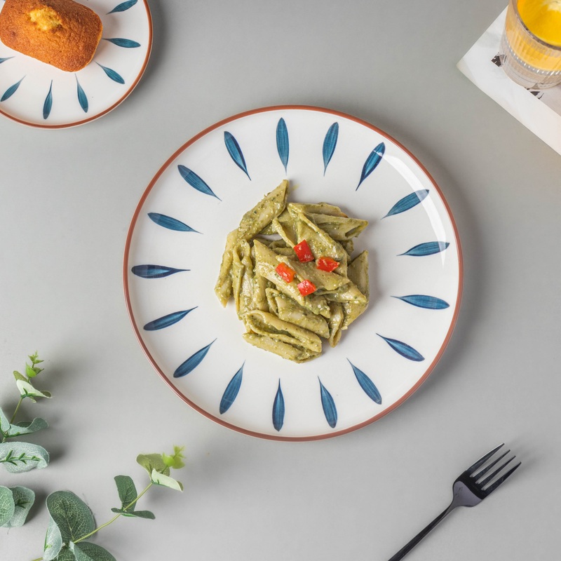 The strong and sturdy ceramic dinner plate with a brown rim is a spectacular addition to the crockery collection for a modern home. The round plate with blue petal-like abstract patterns on the edges will uplift the overall decor. One can serve rice, noodles, ramen, and a variety of main course meals on the plate.