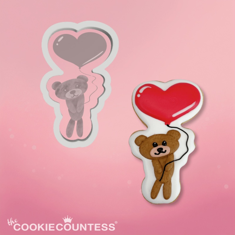 Teddy Bear with Heart Balloon Cookie CutterCutter Measures 2.5" 4.5"All elements of this original cookie cutter were designed by The Cookie Countess with the cookie decorator in mind!An angled cutting edge makes for smooth cuts and easier clean up.Sturdy b