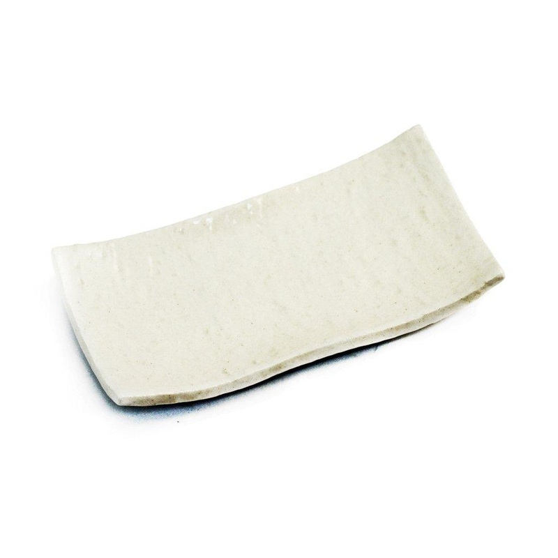 This elegantly crafted ceramic plate features a subtly curved form that adds a touch of uniqueness to the white canvas. The glossy white glaze highlights its gently textured surface, offering a refined, artisanal feel perfect for serving sushi, appetizers, desserts, or small bites.