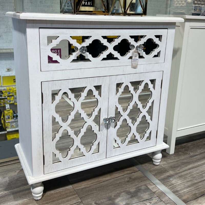 This elegant white wooden cabinet features intricate cut-out patterns on its doors, adding a touch of style and sophistication. With silver knobs and sturdy legs, its both functional and decorative. Perfect for storing your treasures or displaying decorative items. Imagine it gracing your living room or bedroom, effortlessly blending with any decor.