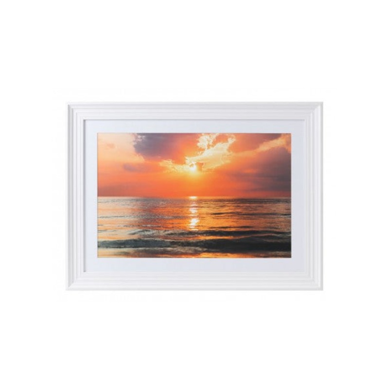 TheGrange Sun Reflection Framed Pictureis a captivating piece of wall art that features a serene sunset scene. The image showcases the sun setting over a calm body of water, with the sunlight reflecting beautifully on the waters surface. The colours in the image are warm and inviting, with hues of orange, yellow, and red in the sky that contrast against the darker blues and purples of the ocean. This framed picture could bring a sense of peace and tranquillity to any room, making it an ideal decor choice for those looking to create a relaxing atmosphere. The white frame around the picture adds a classic touch that would complement various interior design styles.