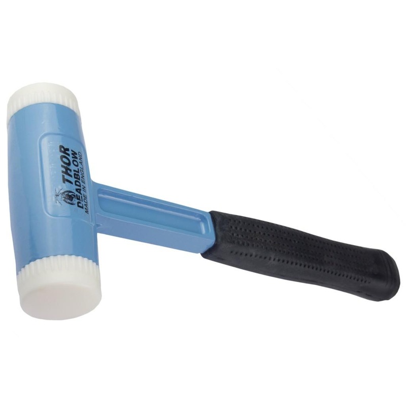 Thorace Nylon Soft Face Hammer. Faces are designed to wear and to be replaced by hand. All faces are one piece moulded. No metal pegs or inserts to damage the workpiece when worn. Serrations in the metal head prevent faces coming loose during use. Faces have a shoulder for extra strength and to prevent fracture from misdirected blows. A cavity inside the head is partially filled with steel shot which adds to the weight, prevents rebound and deliversdead blows of maximum force.