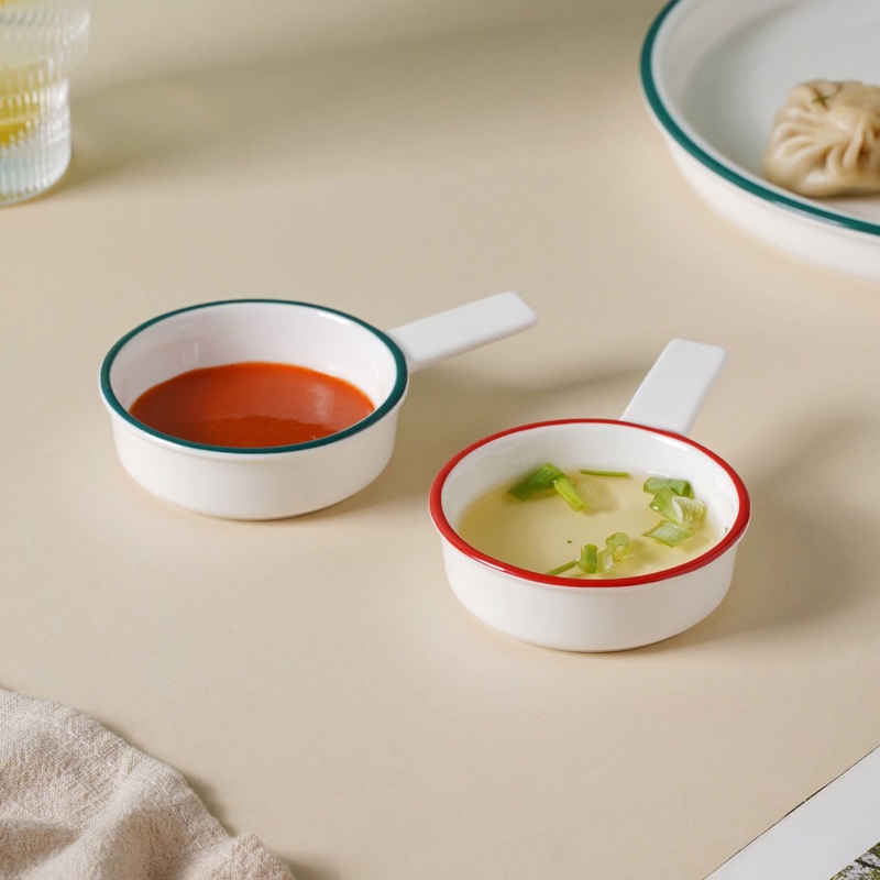 There’s no need to save your finest serving ware for a special occasion. Even the most basic of meals are elevated with the addition of classic white dip bowls with a colorful rim. The ceramic dip bowl comes with a handle, which makes it easy to pour any dip or cheese fondue over the food. The opulent bowls are perfect for serving soy sauce or any other dips to go with sushi or tempura. The contemporary bowls will add a touch of elegance to any dinnerware collection. The bowls are available in two color variants.