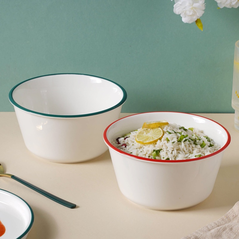 A show-stopper for any occasion, the traditional white snack bowl is a must-have. Snacks, lentils, oats, and delicious homemade curries can all be served in the bowl. The ceramic bowl can be used as a noodle bowl, fruit bowl, or salad bowl, among other things. Any tableware set can be elevated from the addition of the contemporary bowls. With two beautiful color variants on the dish’s rim, the white snack bowl is great for infusing elegance to the dinner table.
