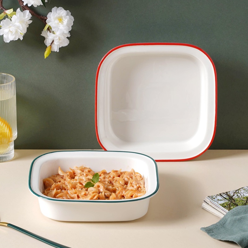 The white baking dish is ideal for roasting chicken or preparing delectable lasagne. In the square baking dish, delicious mac & cheese can be baked. The baking dish can be used to bake, reheat, and serve right away. For a modern and contemporary look, the ceramic baking is a great addition to any tableware collection. On the rim of the white ceramic baking dish, there are two color variants.
