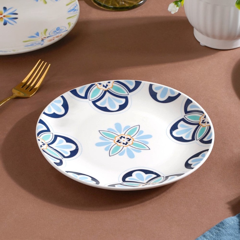 The elegant snack plate features stunning blue floral patterns. The white snack plates can be used as appetiser plates, fruit plates, and for serving evening snacks. The white ceramic plate has a classic, traditional charm that is enhanced by the flower designs on the surface. Any served dish on the plate is elevated by the delicate floral patterns.