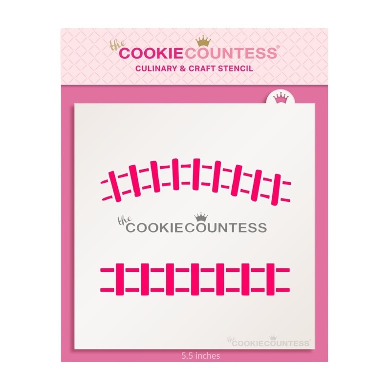 Train Tracks stencil.Overall size approximately 5.5" x 5.5". PINK sections in image are the open sections.For easiest application, use with the Cookie Countess Stencil Adaptor Set.Stencils are 5mil Food Grade plastic, washable and reusable.
