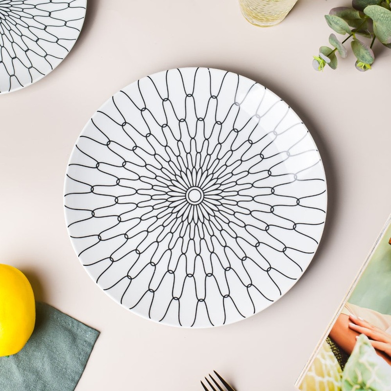 Geometric black lines intertwine to form a kaleidoscopic pattern on the ceramic dinner plate that looks truly hypnotic. The unique design of the plate is the artistic addition that one’s collection deserves. Serve the main course lunch and dinner meals on the plate and elevate the ambiance with a modern vibe and look.
